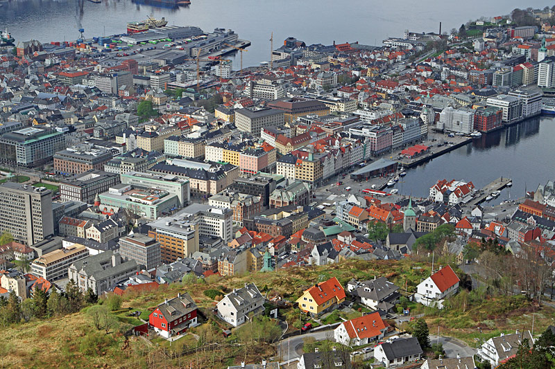 | Bemerkung | Blick nach Westen Richtung Puddefjorden (oben) und dem Hafenbecken "Vågen" (rechts unten) - davor ist der "Torget" mit "Zachariasbryggen" zu sehen - heute stehen auch einige Verkaufsstände auf dem Fischmarkt - oben links im Foto ist außerdem das Forschungsschiff Ramform Explorer am südlichen Kai des Terminals "Nøstegaten" liegend |