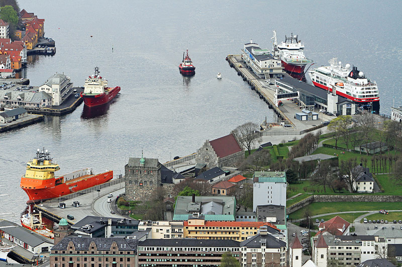 Blick nach Nordwesten über die "Bergenshus Festning" (alte Festung von Bergen) zum Kreuzfahrtterminal Bergen - die beiden grauen Gebäude innerhalb der Festungsanlage hatte ich bereits im Foto 2510 beschrieben - die Schiffe sind (von links nach rechts): der Offshore-Versorger und Ankerziehschlepper EDT Argonaut, der Plattformversorger "Siem Sailor", der Offshore-Versorger und Ankerziehschlepper Northern Commander, der gerade ablegt, der gerade einlaufende Schlepper BB Supporter, sowie die Fram - das Offshore-Fahrzeug oberhalb der "Fram" ist mir nicht bekannt |