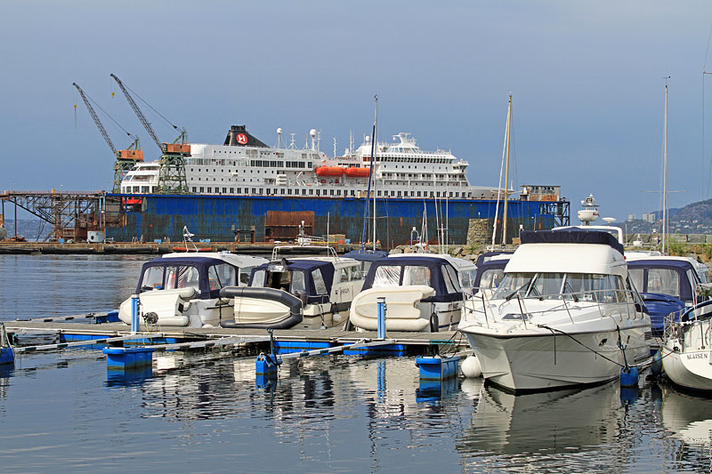 | Bemerkung | Blick vom Südufer des Yachthafens "Kirkebukten" nach Nordwesten zum Schwimmdock der Schiffswerft "Noryards BMV AS", in dem sich derzeit das Hurtigruten Postschiff "Finnmarken" (die heutige Otto Sverdrup) befindet |