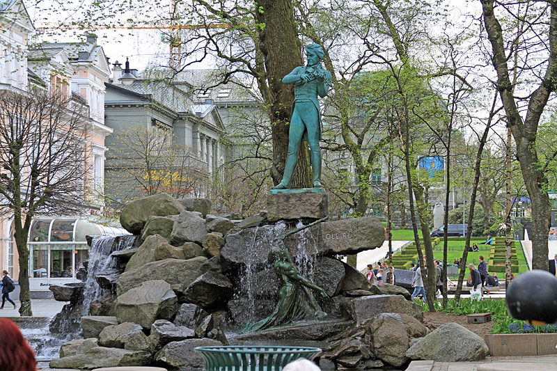 Blick auf die Statue von "Ole Bull" (norwegischer Violinist und Komponist, 1810 - 1880)