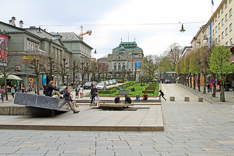 | Bemerkung | nur ein paar Meter weiter - Blick nach Nordwesten entlang des "Øvre Ole Bulls plass" (oberer Ole Bulls Platz) Richtung "Den Nationale Scene" (die Nationale Bühne - 1850), das älteste norwegische Theater mit festem Standort in Bergen - links im Vordergund ist "den blå steinen" (der Blaue Stein) zu sehen, ein neun Meter langer Steinblock aus brasilianischem Sodalith |