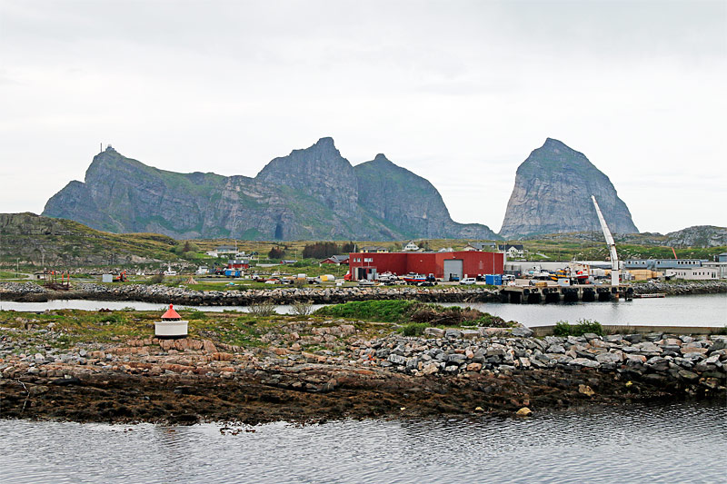 Tag 6 "Træna" - 08:46 - von Südosten kommend treffen wir in "Træna" ein - "Træna" auf der Insel "Husøy" ist das Verwaltungszentrum eines Archipels von ca. 1000 Inseln, 65 km westlich der Festlandsküste gelegen, und behauptet von sich, das älteste Fischerdorf Norwegens zu sein - "Træna" ist manchen bekannt, wegen des alljährlich im Juli stattfindenen Musikfestivals - Blick nach Nordwesten über die Nordspitze von Ytterhakksholmen und über "Hikelen" zur Insel "Sanna" im Hintergrund mit den höchsten Erhebungen des Archipels |