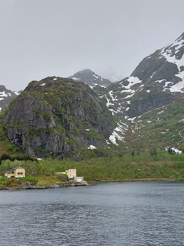 | Bemerkung | 07:47 - wir befinden uns nun in der kreisförmigen Verbreiterung im Innern des Trollfjords - das rechte Gebäude ist ein kleines Wasserkraftwerk, das Wasser des "Trollfjordvatnet" zur Stromgewinnung nutzt |