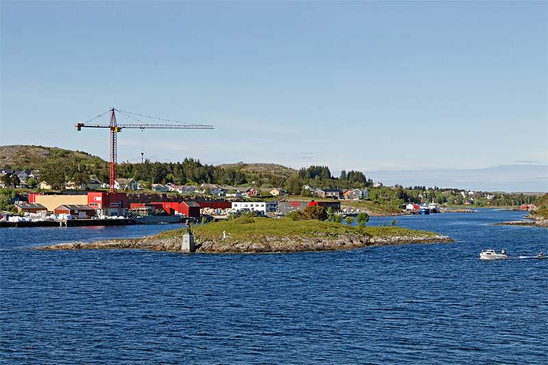 Blick nach Nordnordosten über eine kleine Insel hinweg zum Nordteil des Hafens von "Rørvik" und in den Sund westlich der Insel "Straumsøya"