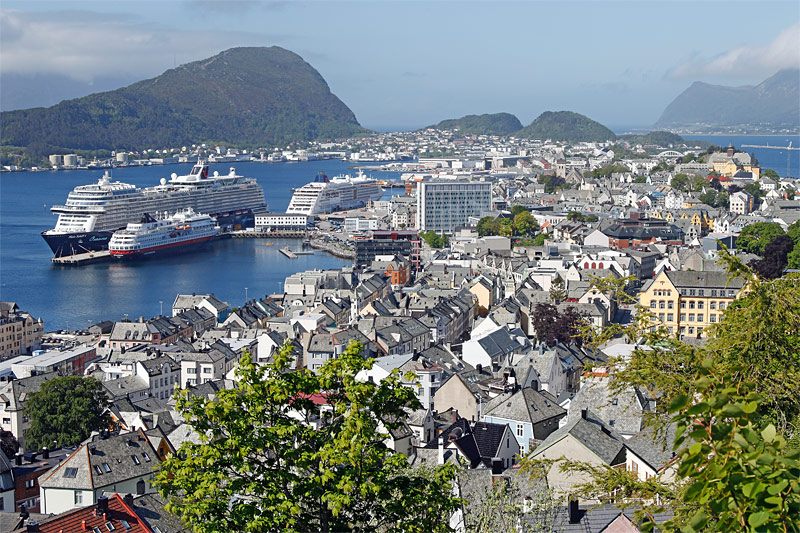 | Bemerkung | 10:50 - wir sind inzwischen von der Aussichtsplattform auf einem Wanderweg zuerst nach Osten und dann weiter nach Südwesten unterwegs und befinden uns nun am oberen Ende der Treppe, die hinunter zur Straße "Vannspringdalen" führt - Blick nach Südwesten Richtung "Aspøya", "Hessa" und "Sula", mit der Kreuzfahrtschiffpier links auf "Nørvøya" |