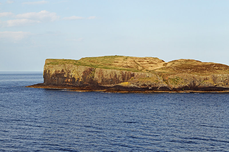 Tag 6 "Staffa und Iona - innere Hebriden - Schottland" - 08:16 - wir haben inzwischen die Insel Staffa erreicht, die wohl imposanteste, durch vulkanische Aktivität geprägte Insel Schottlands - Auszug aus Wikipedia: bereits die Wikinger kannten die Insel. Der Name Staffa leitet sich von ihrem Wort für „Insel der Säulen“ ab. - Für die Entstehung solcher Flutbasaltdecken ist der Austritt großer Magmamengen verantwortlich, der vor rund 60 Millionen Jahren (Tertiär) stattfand. Diese Basalte treten unter dem Meer bis zu benachbarten Inseln, wie Mull und Skye auf und erstrecken sich bis nach Nordirland zum "Giant’s Causeway". - Blick vom Schiff auf den Südteil der Insel, wo die Basaltsäulen am stärksten ausgeprägt sind |