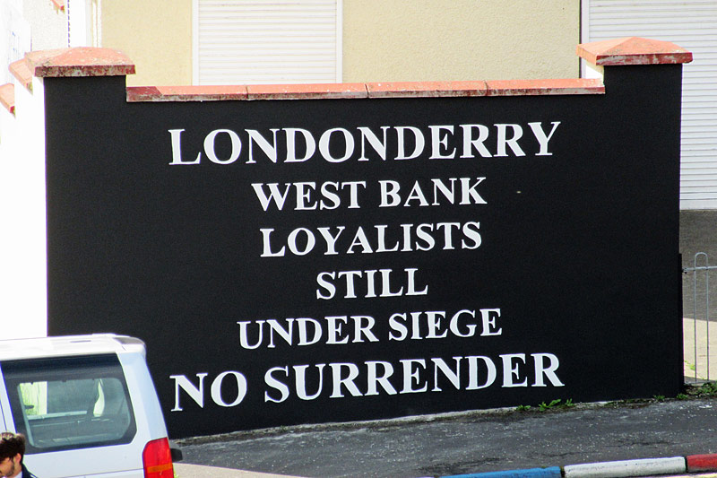 Auszug aus "Derry Smart Tour": Die schwarze Wand mit weißer Schrift an dieser Stelle mit der Aufschrift "Londonderry West Bank Loyalists still Under Siege No Surrender" ist zunächst ein Hinweis auf den Exodus der Loyalisten aus der Stadt. Die Stadt, die historisch überwiegend protestantisch war, wurde größtenteils katholisch und die Bewohner des Bereichs "Fountain" fühlten sich während der Unruhen belagert, da es sich um das letzte überwiegend protestantische Gebiet handelte, das noch auf der Stadtseite verblieben war. Der Teil "keine Kapitulation" ist das, was die Bewohner der Stadt von den Stadtmauern riefen, als "James II." sich 1689 der Stadt kurz vor der Belagerung näherte und die Stadt zur Kapitulation aufforderte. |