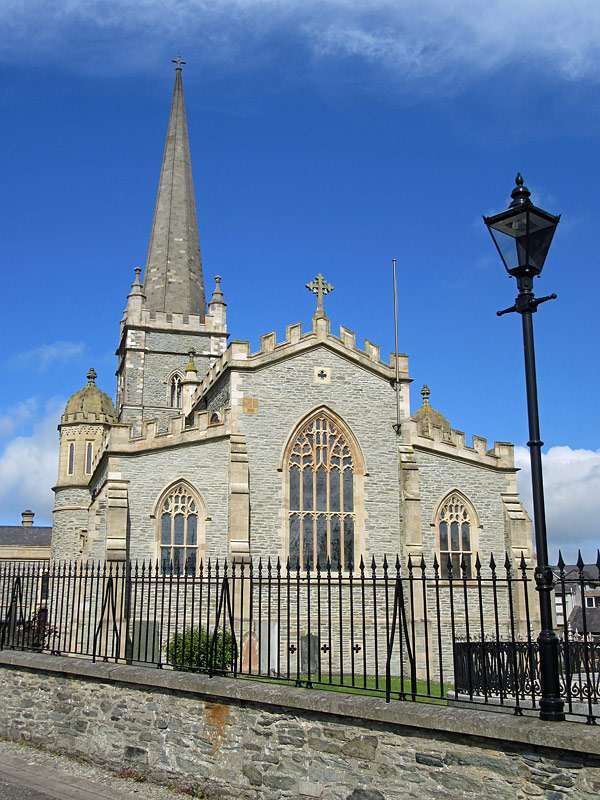 20m weiter südwestlich blicken wir auf die Kathedrale "St Columb's Cathedral" - Auszug aus Wikipedia: Die Kathedrale "Sankt Columban" (englisch St Columb’s Cathedral) in Derry bzw. Londonderry ist eine anglikanische Kathedrale in der Kirchenprovinz Armagh der "Church of Ireland" in Nordirland im Vereinigten Königreich. Sie ist dem "heiligen Columban", einem der zwölf Apostel von Irland, geweiht, der das Christentum in die Region brachte, bevor er nach Schottland ging, um es auch dort einzuführen. "Sankt Columban" ist die erste anglikanische Kathedrale auf den Britischen Inseln, die nach der Reformation erbaut wurde. Ihre Grundsteinlegung erfolgte am 21. August 1628, und sie wurde 1633 von "William Parrot" im gotischen Stil (Planter’s Gothic) fertiggestellt. |