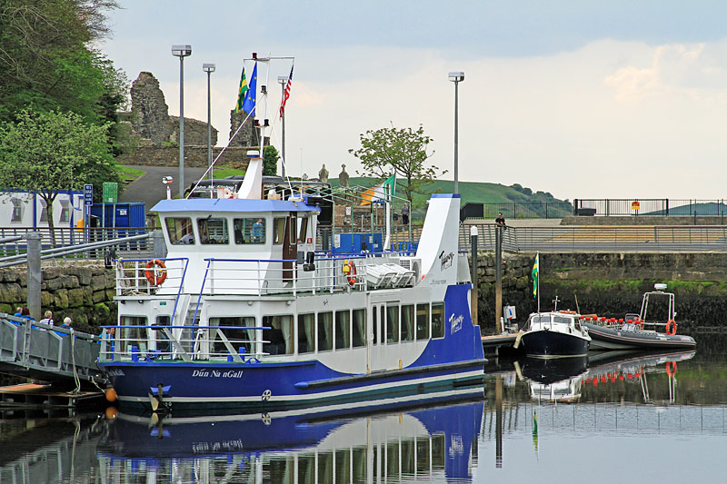 Nahaufnahme des Ausflugsschiffes - auf diesem Foto ist hinter dem Schiff ein Teil der Ruine des "Klosters Donegal" gut zu erkennen