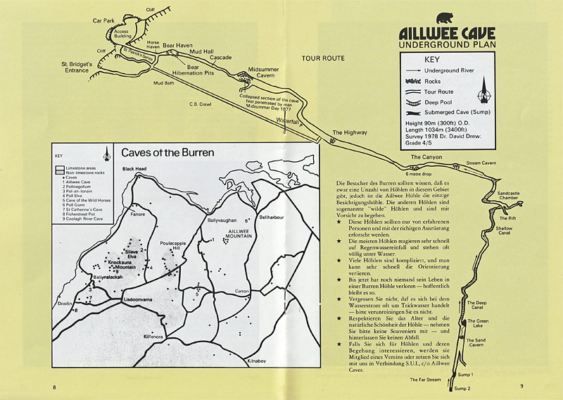 Auszug aus Wikipedia: Die "Aillwee Cave" ist eine Schauhöhle, die im Jahre 1940 zufällig von dem irischen Farmer "Jacko McGann" entdeckt wurde. Er behielt seine Entdeckung zunächst für sich, bis er das Wissen darum in den 1970er Jahren weitergab. Seit dem Jahre 1976 ist die Höhle für die Öffentlichkeit geöffnet. Der Besucher kann auf einer Tour 1,3 Kilometer durch die Höhle gehen. Dabei werden Stalaktiten sowie Stalagmiten gezeigt und deren Entstehung erklärt. Weiterhin führt die Tour an unterirdischen Wasserfällen vorbei. - Scan des deutschsprachigen Untergrund-Plans der Höhle |