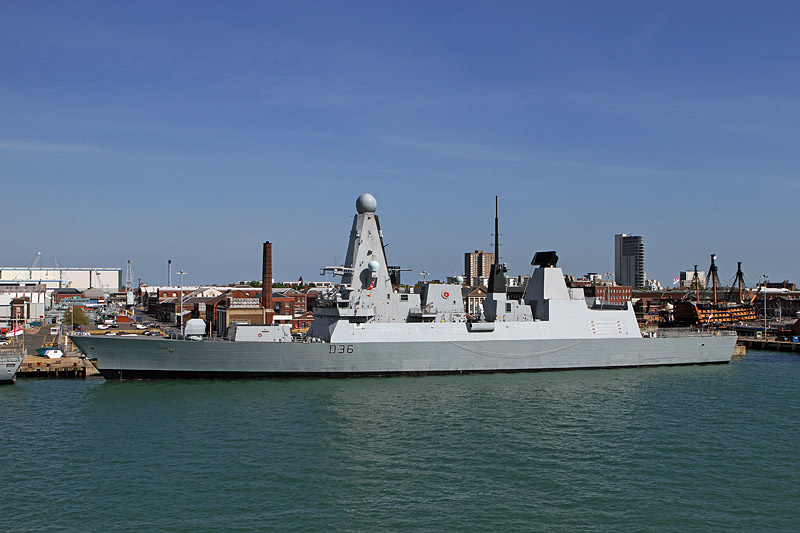 Blick nach Osten zum Kai "Western Way" - im Hintergrund rechts, hinter dem Zerstörer HMS Defender, ist nun das Museumsschiff "HMS Victory" besser zu sehen - Auszug aus Wikipedia: "HMS Victory" war ein Linienschiff ersten Ranges, das Anfang der 1760er-Jahre für die "Royal Navy" gebaut wurde. Bekanntheit erlangte die "HMS Victory" als Flaggschiff von "Vizeadmiral Nelson" in der Seeschlacht von Trafalgar. Sie ist das älteste in Dienst befindliche Kriegsschiff und liegt heute im "Portsmouth Historic Dockyard", wo sie als Flaggschiff des Ersten Seelord und als Museumsschiff dient. |