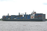 9th ship of a series of identically constructed container ships (9 vessels in design "8200"), also see >CSCL Barcelona<, >Bosun< and >HS Discoverer< - equipped with 3 cranes of a lifting capacity of 45 ts each and 1 crane of 35 ts |