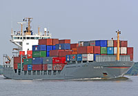 4. Schiff einer Serie baugleicher Feeder-Containerschiffe vom Sietas Typ 156 (5 Einheiten - deutsche Eis-Klasse E3, Brücke mit weißen Fensterrahmen, mit mittelhohen Staugerüsten vor dem Aufbau, 1 geschweißtes Deck), siehe auch (>Nova<, >Pirita<), (>Arctic Ocean<, >Elusive<, >Njord< - IMO 9123805), (>Arctic Fox<, >Atlantic Coast<) und >Jessica B< |