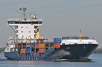 8. Schiff einer Serie baugleicher Feeder-Containerschiffe vom Sietas Typ 172 (8 Einheiten - deutsche Eisklasse E3, geschlossene Nock, schwarze Fensterrahmen, 1 geschweißtes Deck), siehe auch (>Gotland<, >Tina< - IMO 9277383), (>Helgaland<, >Page Akia<, >Helga<), >Öland<, (>Tavastland<, >Francop<) und (>Götaland<, >Lisa<) - nun mit neuem dunkelblauen Rumpfanstrich - das Schiff wurde 2010 in >Fenja< umbenannt, siehe auch dort |