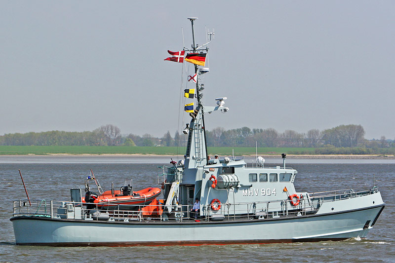 on the occasion of the Hamburg harbour birthday, the patrol craft of the Danish Royal Navy >HDMS Lyø< is on the way to join the entering parade