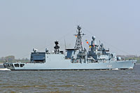 "Bremen" class frigate and type ship of type F-122 (8 vessels, also see >Augsburg< and >Lübeck<), 4th frigate squadron, Wilhelmshaven - main armament: 8x RGM-84C Harpoon SSM, 1x 8 VLS SAM system Mk 29 (24 Sea Sparrow missiles), 2x 21-round CIWS SAM missile launcher "RAM" Mk 49, 1x 76-mm gun OTO Melara SuperRapid DP, 2x 20-mm AA gun Rheinmetall Rh-202, 2x fixed twin 324-mm ASW torpedo tubes Mk 32, 2 multipurpose helicopters "Sea Lynx" Mk 88 - after 32 years of service and 1.5 million kilometers at sea, the >Bremen<, then placed in the Naval Arsenal in Wilhelmshaven, was decommissioned on March 28, 2014 - |