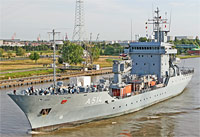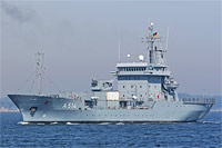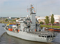 "Elbe" class multipurpose tender [AR] and 4th ship of type 404, PTG tender (6 vessels, also see >Elbe< and >Donau<), 3rd minehunting squadron, Kiel, minecraft tender - main armament: 2x 27-mm AA rapid gun Rheinmetall MLG 27, 2x Stinger (Fliegerfaust) SAM positions - equipped with 1 crane of a lifting capacity of 13 ts |
