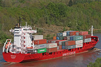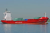 6th ship of a series of identically constructed feeder container ships of type "RW 700" (18 vessels - 4 with and 14 without cargo gear), also see >Mira J<, >Marstan<, >Veersedijk<, >Sirrah<, >Värmland<, (>Cepheus J<, >X-Press Monte Cervino<), >Atair J<, >Herm J< and >Rogaland< - now with the new UniFeeder funnel sign |
