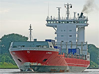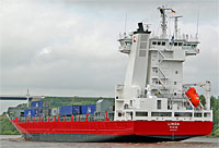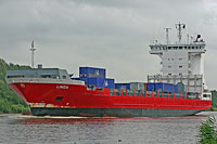 Typschiff eines Paares baugleicher Feeder-Containerschiffe vom Sietas Typ 174a (geschlossene Nock, weiße Fensterrahmen, ohne Ladegeschirr), siehe auch das Schwesterschiff >Aila< sowie die typverwandten Schiffe >Arnarfell< und >Helgafell< (Standard-Typ 174) |