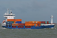 11th ship of a series of identically constructed feeder container ships of Sietas type 151 (23 vessels - German ice class E, in spite of given grain and bale data classified as container ship, closed bridge wing, not supported on both sides, with sloping side windows, 1 welded deck) - after change of operator and flag |