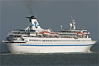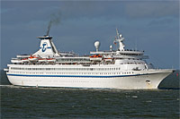 2. Schiff eines Paares nahezu baugleicher Kreuzfahrtschiffe - es wurde 1980 um 30m verlängert - das Schiff wurde 2008 in >Aquamarine<, 2010 in >Ocean Star Pacific< und 2014 in >Pacific< umbenannt - am 19. Februar 2015 erreichte das Schiff Alang, Indien und wurde dort am 22. Februar am Plot Nr. 61(24G) auf Grund gesetzt, um von der NBM Iron & Steel Trading Pvt. Ltd., Bhavnagar verschrottet zu werden |