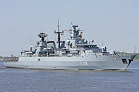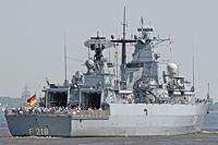 "Brandenburg" class frigate and 4th ship of type F-123 (4 vessels, also see >Bayern<), 2nd frigate squadron, Wilhelmshaven - main armament: 4x MM 38 Exocet SSM, 1x 4 VLS SAM system Mk 49 (16 Sea Sparrow missiles), 2x 21-round CIWS SAM missile launcher "RAM" Mk 49, 1x 76-mm gun OTO Melara SuperRapid DP, 2x 20-mm AA gun Rheinmetall Rh-202, 2x fixed twin 324-mm ASW torpedo tubes Mk 32, 1 - 2 ASW helicopter Super Lynx |