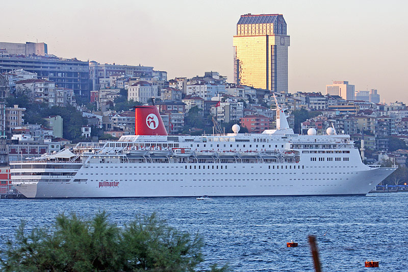 in Istanbul (Türkei), gegenüber Eminönü, bei Karaköy am Pier für Kreuzfahrtschiffe liegend