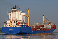 Typschiff einer Serie baugleicher Feeder-Containerschiffe (12 Einheiten im Design "Odely 1300"), siehe auch >Süderoog<, >Hooge<, (>Langeness<, >MSC Vilinius<), >Balkan<, >Heluan<, >Wybelsum<, >Petkum< und >Mercs Jaffna< - ausgestattet mit 2 Kranen á 45 ts Tragfähigkeit |