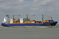 8th ship of a series of identically constructed container ships of type "VW 2500" (22 vessels), also see >CSAV Peru<, >CSCL Fuzhou<, >CSAV Yokohama< and >Martha A< - equipped with 3 cranes of a lifting capacity of 45 ts each |