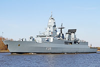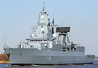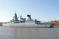 "Sachsen" class frigate and type ship of type F-124 (3 vessels, also see >Hamburg<), 2nd frigate squadron, Wilhelmshaven - main armament: 8x RGM-84F Harpoon SSM, 1x 32 VLS SAM system Mk 41 (24 standard SM-2 and 32 Sea Sparrow missiles), 2x 21-round CIWS SAM missile launcher "RAM" Mk 49, 1x 76-mm gun OTO Melara SuperRapid DP, 2x 27-mm AA gun Rheinmetall-Mauser MLG 27, 2x triple 324-mm ASW torpedo tubes MU-90, 2 ASW helicopter Super-Lynx |