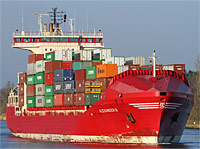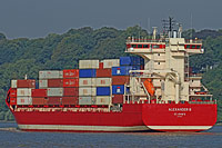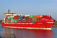 15. Schiff einer Serie typgleicher Feeder-Containerschiffe vom Typ "Baltic-Max PW 1200" der Peene-Werft (15 Einheiten, 7 mit und 8 ohne Ladegeschirr) - mit geschlossener Nock, siehe auch >Izmir Express<, >Yigitcan A<, >Vivien A<, >Gabriel A<, (>Maersk Rome<, >Frederik<) und >Maersk Rundvik< + 8 Einheiten vom Typ "improved Baltic-Max PW 1200", siehe hier auch >Cape Falster< - nach Betreiberwechsel und Flaggenwechsel |