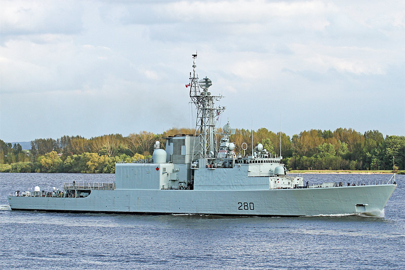 Comment at the end of the outward bound parade of the Hamburg Harbour birthday 2013 >HMCS Iroquois< is leaving Hamburg