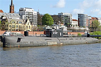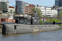 former Russian "Tango" class espionage submarine, project: 641B "Som" (originally 18 vessels - one of 3 modified vessels) - in 2002 the submarine was decommissioned and bought from the "U-Bootmuseum Hamburg GmbH" and transferred to Hamburg the same year - displacement surfaced: 3,000 ts, dived: 3,900 ts |
