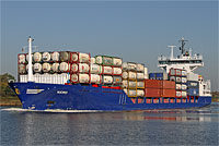 2. Schiff einer Serie baugleicher Feeder-Containerschiffe vom Sietas Typ 156 (5 Einheiten - deutsche Eis-Klasse E3, Brücke mit schwarzen Fensterrahmen, ohne Staugerüste vor dem Aufbau, 1 geschweißtes Deck), siehe auch (>Nova<, >Pirita<), (>Arctic Ocean<, >Elusive<), (>Arctic Fox<, >Atlantic Coast<), >Maike D< und >Jessica B< - jetzt mit Schornsteinmarke und nach Eignerwechsel |