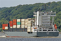 3. Schiff einer Serie baugleicher Feeder-Containerschiffe vom Sietas Typ 168V (6 Einheiten - deutsche Eis-Klasse E3, Open hatch-Containerschiff, verlängert, geschlossene Nock, schwarze Fensterrahmen, 1 geschweißtes Deck) - 02/2008 bei KG Norderwerft GmbH & Co., Hamburg, Bundesrepublik Deutschland um ein Cargosegment verlängert - siehe auch >Ida Rambow<, >Elite<, (>Baltic Swan<, >Akacia<), >Elan< und (>OOCL Finland<, >Gorky Park<, >Anina<) - siehe auch >OOCL Nevskiy< (Standard-Typ 168), >Maersk Flensburg< (Typ 168a) und >Larissa< (Typ 168b) - nach erneutem Manager- und Betreiberwechsel aber Rumpf noch in "Döhle"-Farbe |