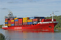 single ship of Sietas type 164a (German ice class E3, classified as container ship, 1 welded deck) - also see the type related ships >Containerships VI< (standard type 164) and >Containerships VIII< (type 164b) - meanwhile the ship is equipped with a scrubber for waste gas purification |