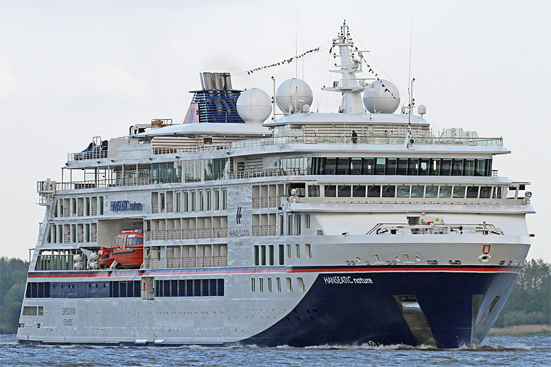 Bemerkung nach ihrer Taufe am Vortag verlässt die >HANSEATIC nature< den Hamburger Hafen zu ihrer ersten Expeditionsreise