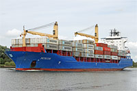 8th ship of a series of identically constructed feeder container ships (12 vessels in design "Odely 1300"), also see >Norderoog<, >Süderoog<, >Hooge<, (>Langeness<, >MSC Vilinius<), >Balkan<, >Heluan<, >Wybelsum< and >Mercs Jaffna< - equipped with 2 cranes of a lifting capacity of 45 ts each - after change of manager |