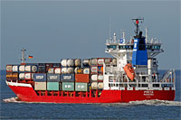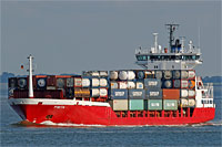Typschiff einer Serie baugleicher Feeder-Containerschiffe vom Sietas Typ 156 (5 Einheiten - deutsche Eis-Klasse E3, Brücke mit weißen Fensterrahmen, mit hohen Staugerüsten vor dem Aufbau, 1 geschweißtes Deck), siehe auch >Nova<, (>Arctic Ocean<, >Elusive<, >Njord< - IMO 9123805), (>Arctic Fox<, >Atlantic Coast<), >Maike D< und >Jessica B< - nun nach erneutem Eigner- und Managerwechsel |