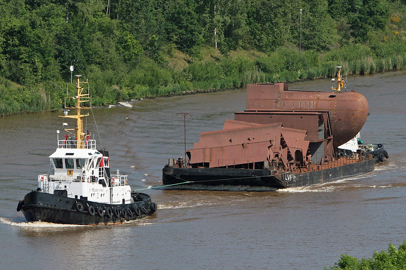 (less visible) and a flat top barge, carrying hull parts