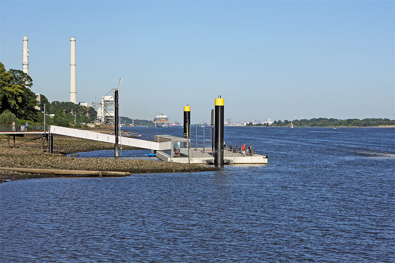 right at the entrance of the small marina of "Schulau". This location is only practical during the sommer months from about 6:30 p.m. until sunset. Good parking facilities are located approximately 5 minutes walk away. A focal length up to 135 mm is sufficient. From this location the Elbe is visible as far as the most west harbour areas of "Hamburg". Since June 2011 the view is somewhat limited due to the new ferry pier, which now is the better photo location (see next photo). But this would only be effective when no cruise liners are leaving Hamburg, because then the pier will be full of spectators up to the last meter. |