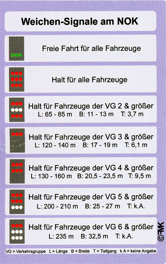 The Kiel Canal (NOK) is a narrow waterway. For this reason, there are a number of passing points, canal widenings distributed over the canal, in which ship encounters are possible, which are not permitted on the open waterway. For this purpose, the ships are scaled in 6 sonamed traffic groups (VG), depending on length, width and draught and the passing points are equipped with a corresponding signal system. The offered scan shows the different passing point signals and their significance (unfortunately only in German language). Please note: in the western part of Kiel canal (between Brunsbuettel and the passing point Schuelp) ships may pass up to "VG 8" in summary, in contrast in the eastern part of Kiel canal (between the passing point Schuelp and Holtenau) currently only up to "VG 6". In this case only one example: the signal "STOP for vessels of VG 3 and larger" in the western part means, that a ship of "VG 6" is sailing in opposite direction and has to pass inside the passing point. In a similar situation in the eastern part the signal "STOP for all vessels" would appear. |