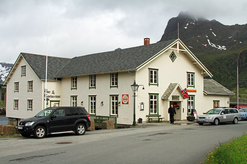 the reception and restaurant "Børsen Spiseri" of "Svinøya Rorbuer". To the right the beginning of the bridge "Bukkedauen" is visible.