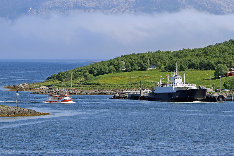 | Comment | we have passed the fog zone, which is still visible in the background. View northward towards the southern end of the island "Handnesøya", from which a ferry is just leaving bound for "Nesna". A fishing boat is just passing the "Handnessundet". |