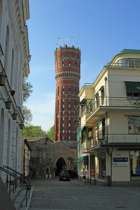 | Bemerkung | Blick von der gleichen Position in nördlicher Richtung durch die Straße "Västra Vallgatan" auf einen Teil der Stadtmauer und zum alten Wasserturm. Die weiße Gebäudefront am linken Bildrand gehört zum Theater von Kalmar "Kalmar Teater". |