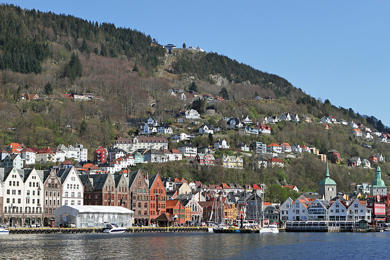 | Comment | view across the harbour basin southeastward towards "Bryggen" (Hanseatic Quarter) - these are buildings which, after the demolition of the old buildings, were rebuilt after 1901 in brick construction, but rebuilt with the gables in the old style - above you can see the cable railway up to "Fløyen", on the far right again "Torget" |