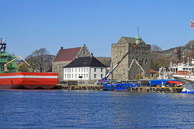 | Comment | view more northward towards "Festningskaien" - the two gray buildings are "Haakonshallen - City museum of Bergen" (medieval royal court and banquet hall - left) and "Rosenkrantztaarnet" (medieval royal tower - right) - to theleft you can see the stern of the platform supply vessel Juanita |