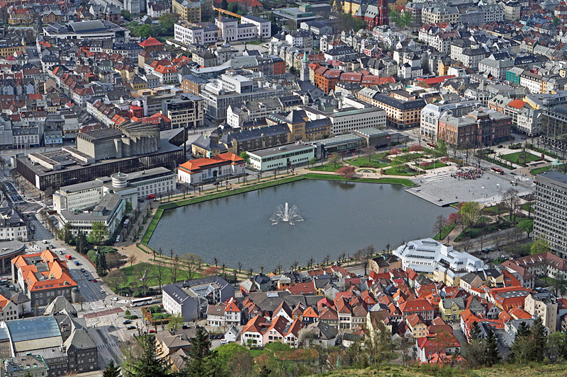 another view southwestward towards the lake "Lille Lungegaardsvannet" with the green areas and the "Festplassen" (fairground) to the right of it