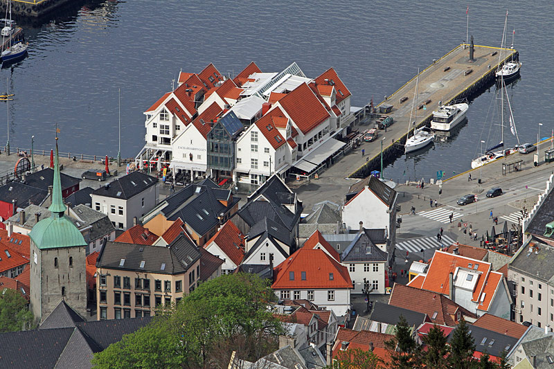 close-up photo of "Zachariasbryggen" and the pier "Shetlands-larsens Brygge" to the right - in the foreground, on the lower left, you can see a part of the "Korskirken"