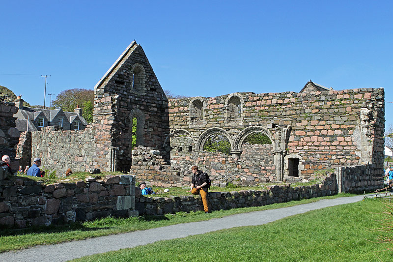 03:00 p.m. - we are now on our tour and arrive at the ruins of "Iona Nunnery" - excerpt from Wekipedia: the nunnery was founded either in 1207 or 1208. It was dedicated to either "Saint Mary" or "Saint Oranna" and, according to the Holy See, belonged to the Augustinian order and not, as is sometimes claimed, to the Benedictine order. In 1574 the headwoman gave up the land, which is why it seems logical that the monastery was abandoned at this point. In 1923 parts of the ruins were restored. Four silver spoons and fragments of a golden ribbon were found. Numerous sculptures and worked stones were found on the site. |